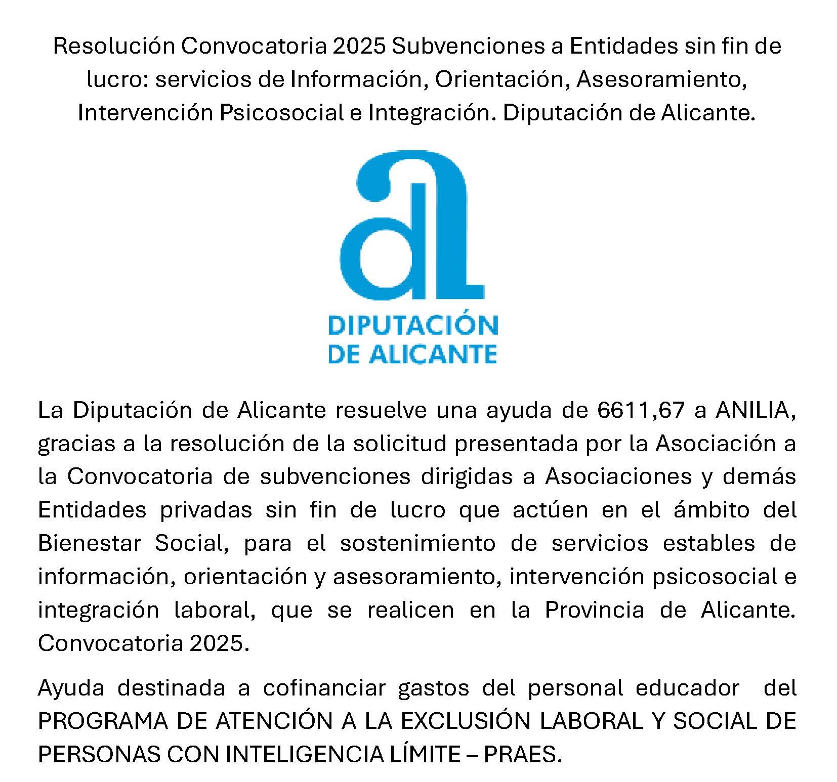 Un año más, Anilia cuenta con la  colaboración de la ALDES de Alicante para el desarrollo de su programas CAPACITAD@S. . RESOLUCIÓN DE CONCESIÓN Y DENEGACIÓN DE SUBVENCIONES A ENTIDADES SIN ÁNIMO DE LUCRO PARA EL FOMENTO DE LA INSERCIÓN LABORAL, LA INNOVACIÓN SOCIAL Y EL EMPRENDIMIENTO EN LA CIUDAD DE ALICANTE, AÑO 2025   […]